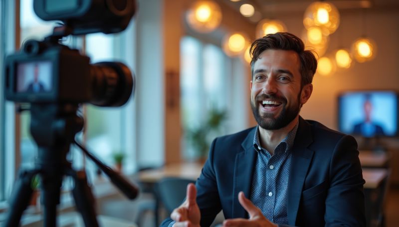 Bearded business man gives interview on camera. Smiles, speaks, gestures with hands with enthusiasm. Professional guy talks in modern office studio. Video recording for corporate media broadcast. Pete / stock.adobe.com