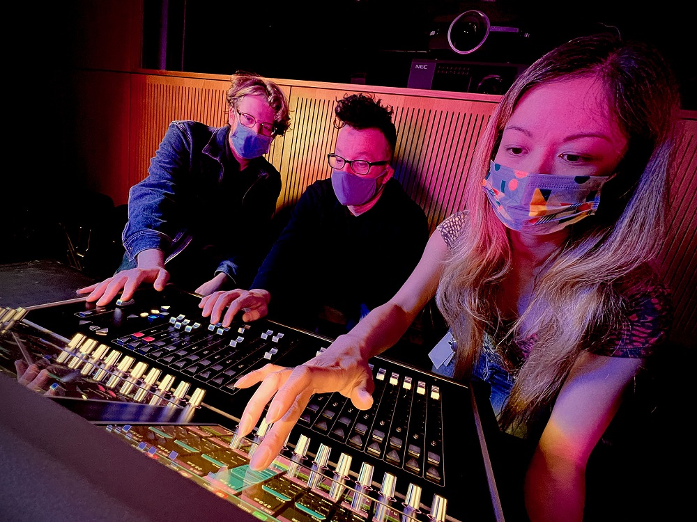 (Left to right) Sam Clapp, Matthew Test, and Audra Jacot at the new DiGiCo S21 console used to mix front-of-house sound for the MCA’s Edlis Neeson Theater.