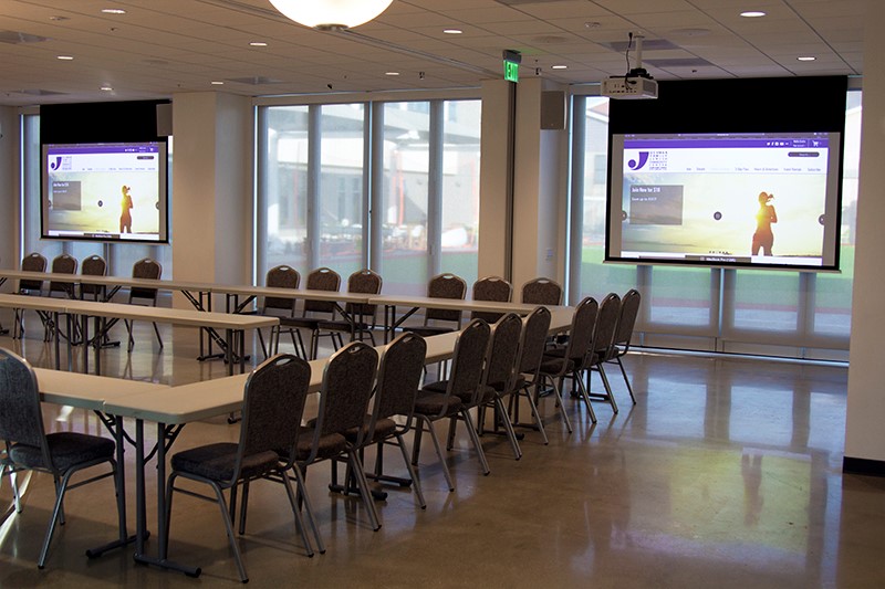 The two-story building features a large area on each floor that can be divided in half by a moveable air wall, so it can host up to four different events at once. Each of the four interactive classrooms includes a projector and dedicated audio equipment.